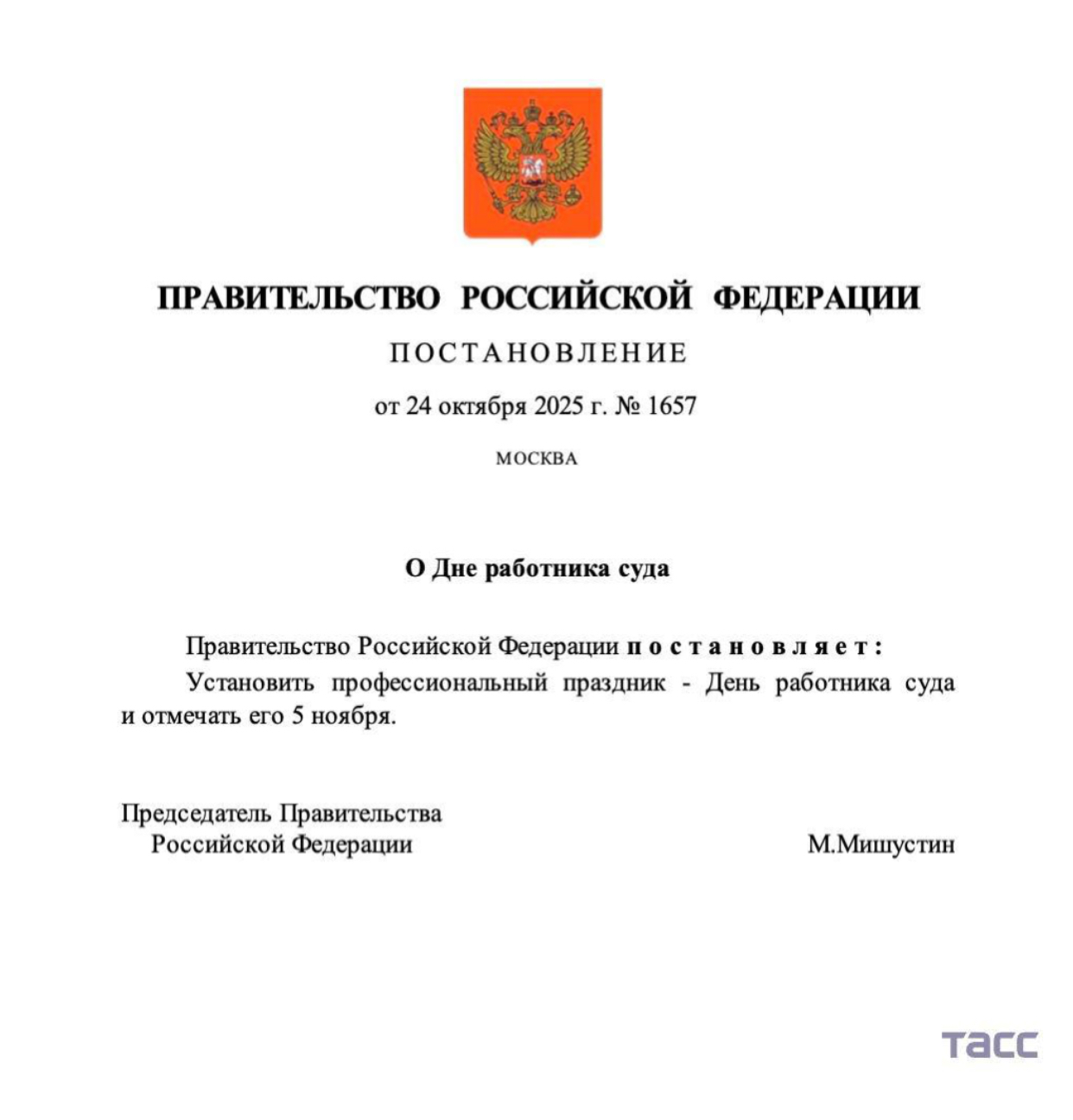 Постановление от 24 октября 2025 года №1657 Новый профессиональный праздник – День работника суда будет ежегодно отмечаться 5 ноября. Постановление об этом подписано.Празднование приурочено к дате издания указа Императора Всероссийского Петра I «О форме суда». Этот указ увидел свет в 1723 году. Документ установил порядок рассмотрения дел судами и определил, что гражданские дела и большая часть уголовных дел рассматриваются при непосредственном участии обеих сторон. Кроме того, предусматривались положения о действиях суда по вызову истца или ответчика, а также о праве суда применять к сторонам меры принуждения, например, в виде ареста.Инициатива установления праздничной даты была поддержана Президентом, к которому обратился Председатель Верховного Суда Игорь Краснов. |